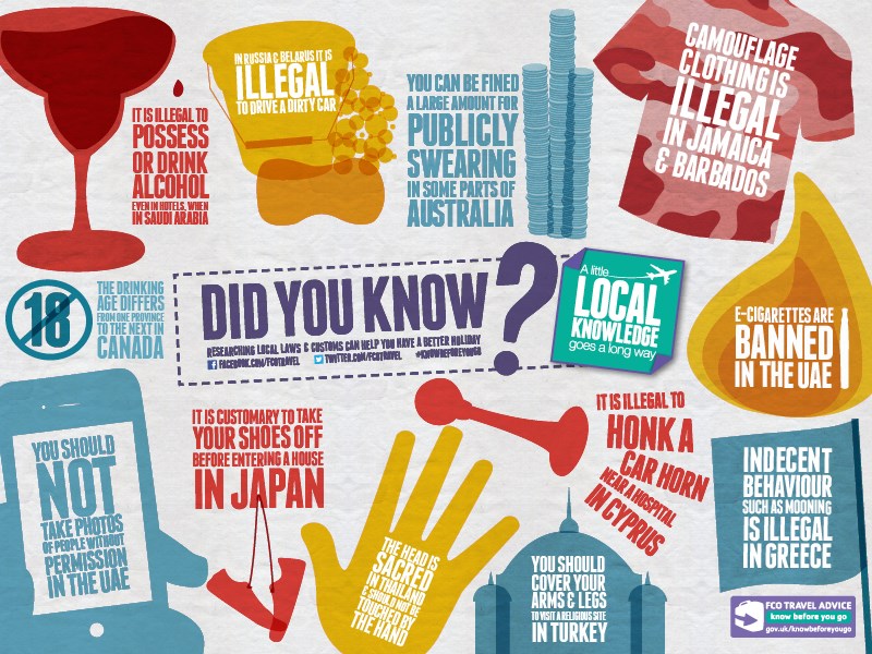 How many cigarettes can you legally bring into Thailand? What equipment should you carry in your car when driving in France? What is appropriate attire to wear in public in Saudi Arabia? Wherever you are going, the FCO’s travel advice pages have a laws and customs section for each destination and are a great place to begin your research. Also take a look at our infographic for some interesting examples from around the globe.